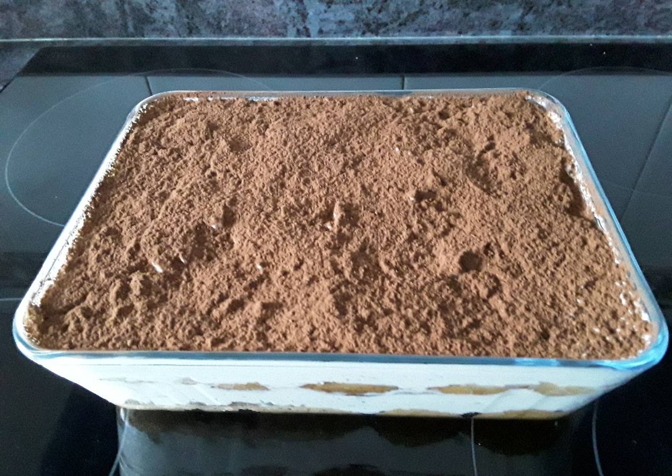 - Con las galletas mojadas en el café, forramos el fondo de una fuente, encima extendemos la mitad de la crema, con la ayuda de un colador ponemos una capa fina de cacao, colocamos otra capa de galletas mojadas, la crema restante, terminando con otra capa de cacao.