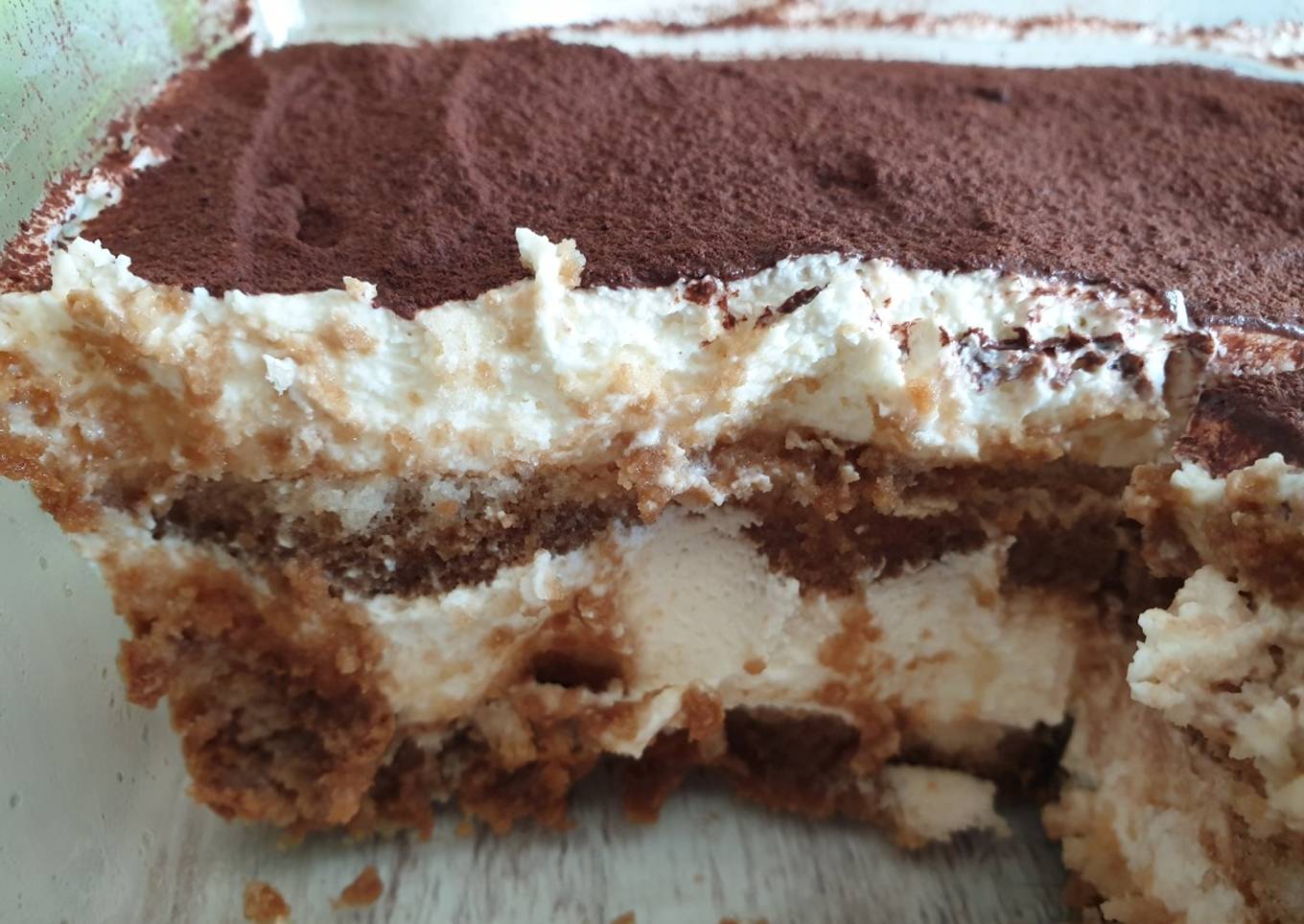 Es el tipo de tiramisú que más me gusta, sin el peligro del huevo crudo, compacto y sabroso. Los bizcochos de soletilla bien mojaditos y no hay problema de que se disperse el lícor ya que la crema tiene mucho cuerpo.