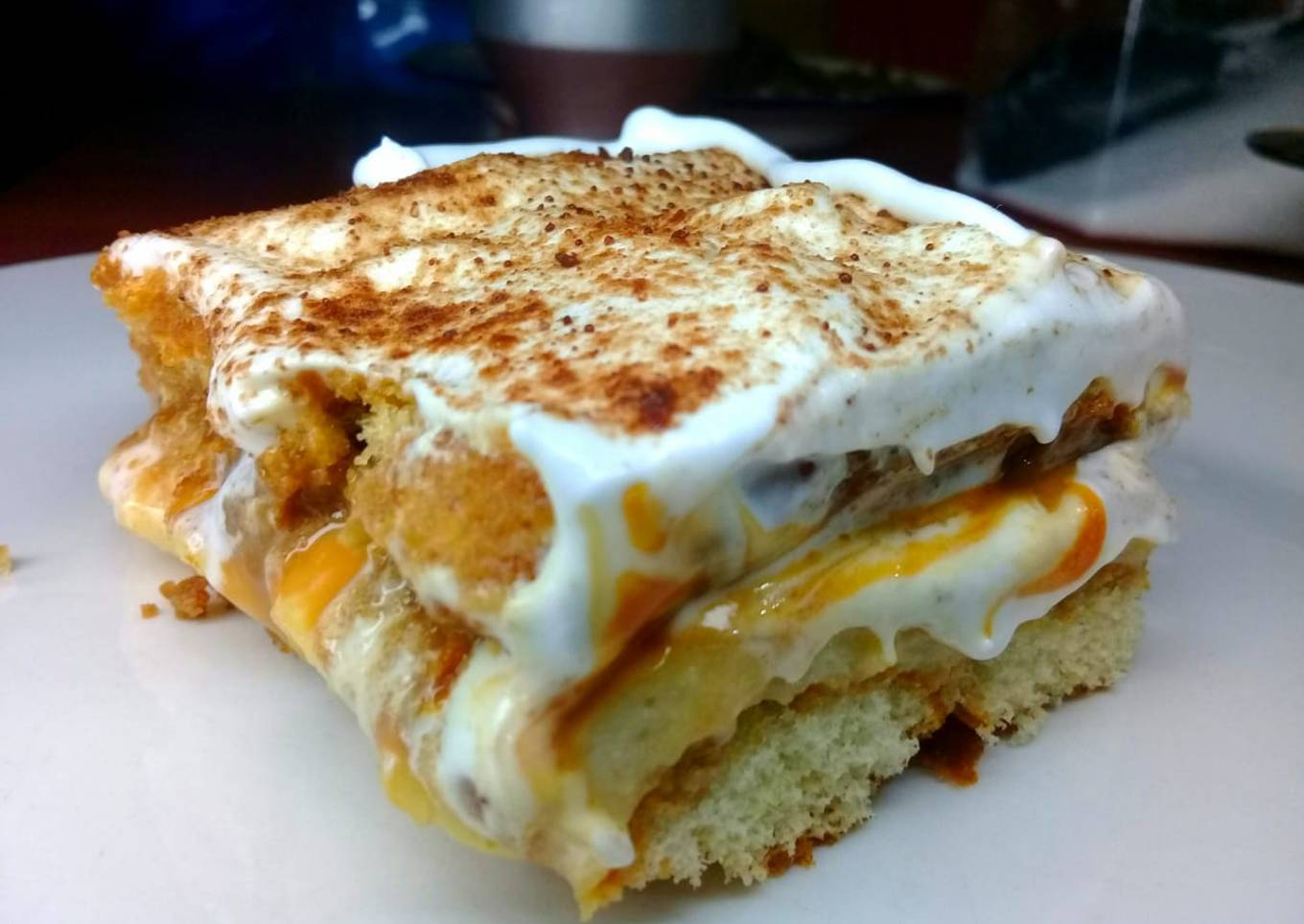 - Luego el dulce de leche arriba y después el segundo piso de vainillas con el mismo paso de mojar las vainillas.. y por último el merengue italiano polvoreado con cacao