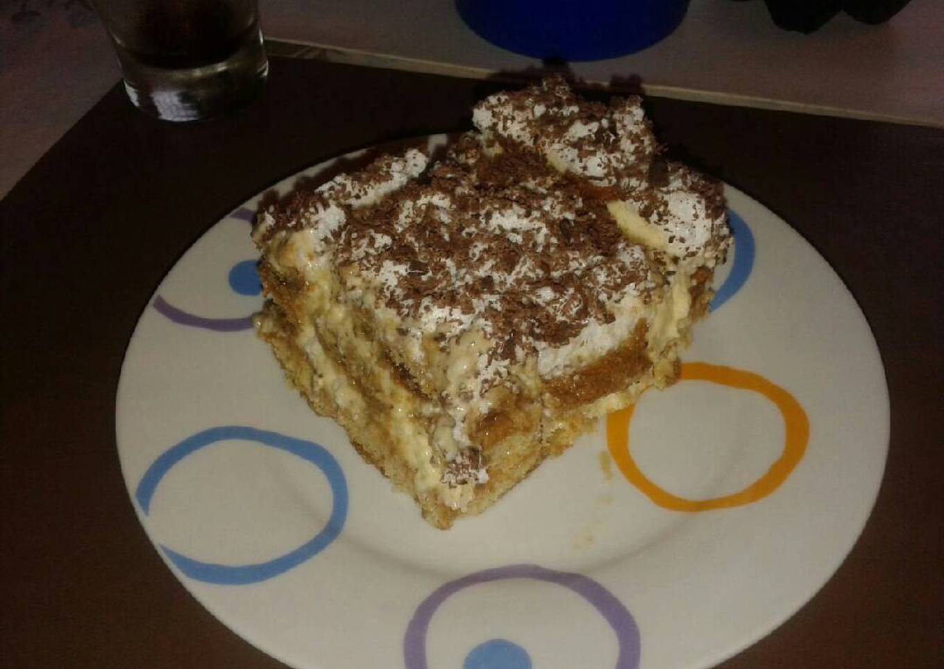 - Terminar con una capa de vainillas mojadas y realizar un merengue con 4 claras y 4 cucharadas de azúcar batiendo a baño María hasta espumar bien. Cubrir las vainillas y decorar con el chocolate rallado.