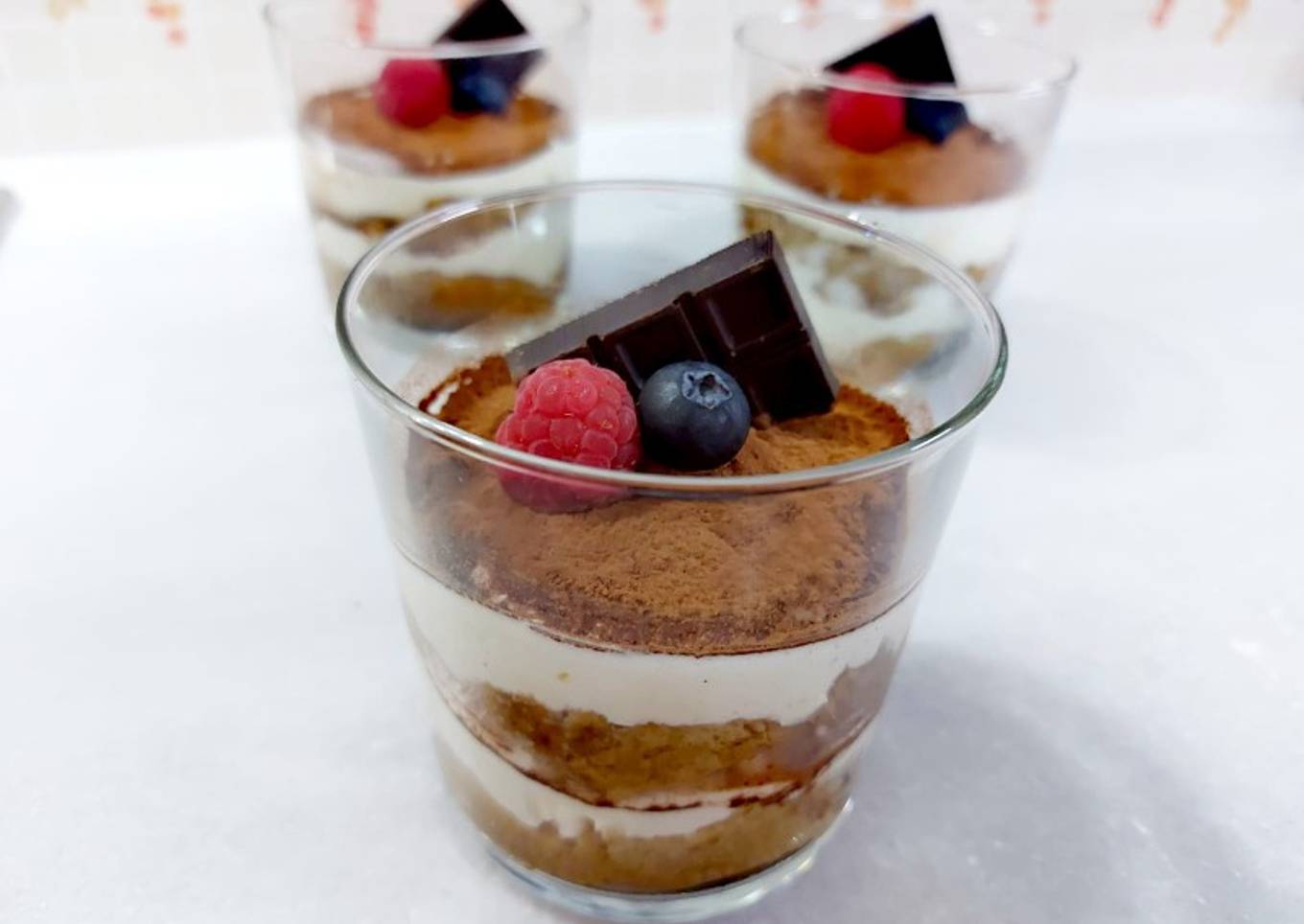 - Repetimos estos pasos otra vez: bizcocho mojado en café, crema y chocolate en polvo. Limpiamos los bordes de los vasitos para que queden aseados y los introducimos en la nevera durante al menos 4-5 horas antes de comerlos.