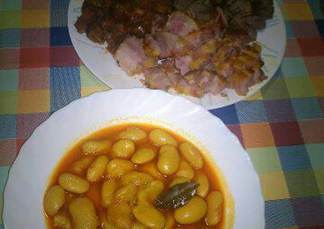 - Añadimos las alubias y el caldo de carne o agua(hasta que cubra). Lo ponemos otra vez a fuego y cuando silbe dejar de 6-8 minutos. Dejamos salir el vapor, abrimos y añadimos el azafrán y el laurel. Cerraremos por ultima vez y cuando silbe dejamos de 3-4 minutos. Yo no le eche sal pero probar y echarle si le hiciese falta