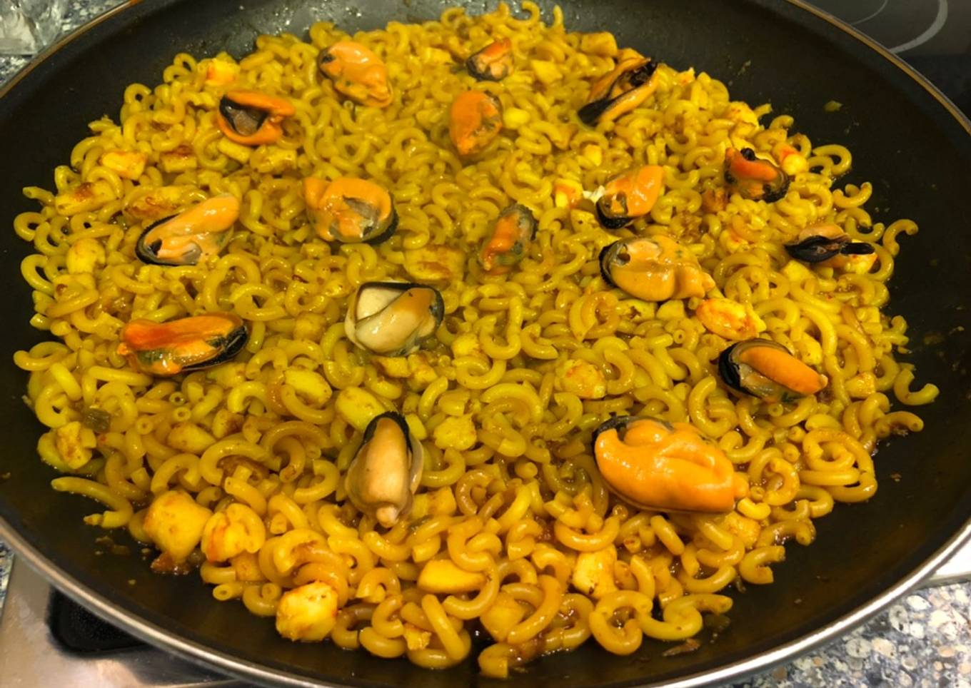 Fideuá de mejillones, sepia y langostinos