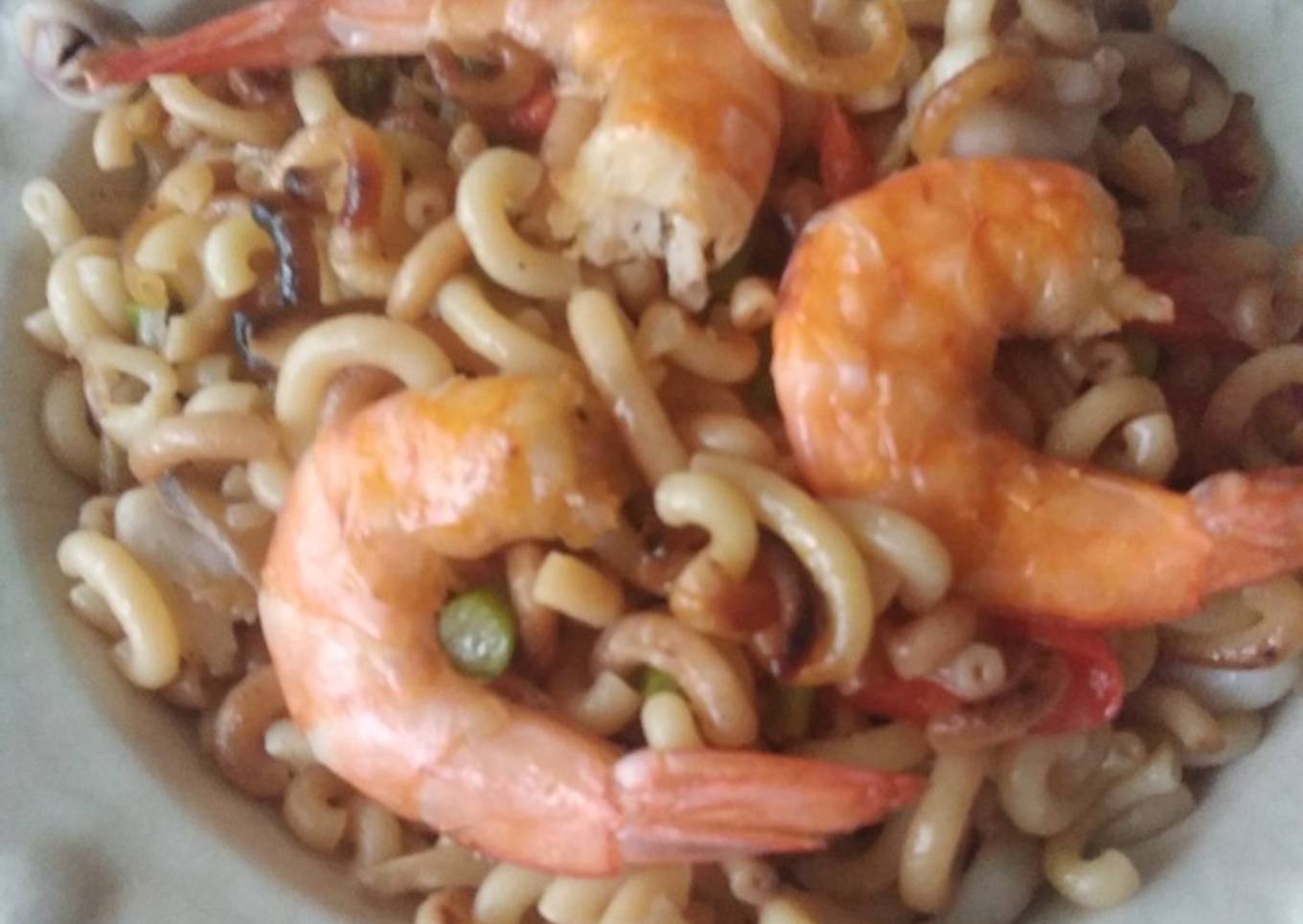 - Damos un par de vueltas y añadimos los fideos, la costilla de cerdo, removemos y añadimos el caldo, a fuego fuerte, cuando empiece a hervir bajamos el fuego y ponemos los Langostinos (sin Cabeza ni patas)