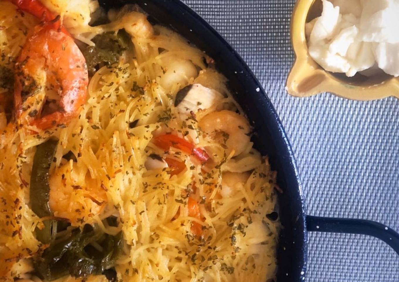 - Por último, calentamos el horno a 150º y dejamos que se ricen los fideos en la parte superior. Os recomiendo servirla con un pelín de salsa alioli