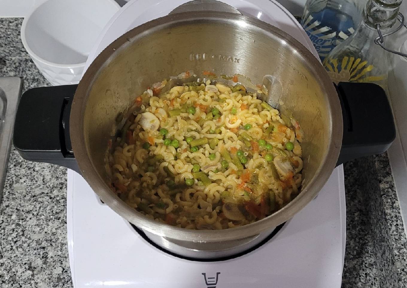 - Finalmente, echamos los fideos y los guisantes para realizar COCCIÓN (7 minutos; Velocidad 1; MARCHA ATRÁS; y 100° C).