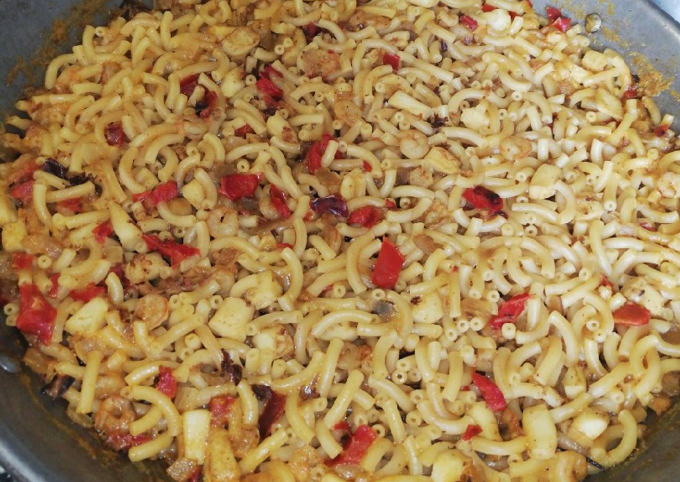 - Añadimos los fideos. Removemos y añadimos el pimentón dulce. Una vez lo tengamos todo bien mezclado, vertemos el caldo de pescado (yo he utilizado uno que hice casero y que tenía congelado) y esparcimos un poco de colorante. Cocemos a fuego medio hasta que se chupe el caldo y disfrutamos!