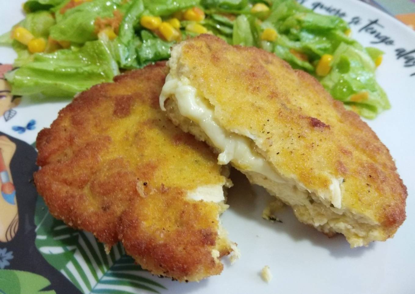 - Con las manos humedecida vamos cogiendo porciones de masa, la aplanamos ponemos queso y luego lo cubrimos con más carne.
