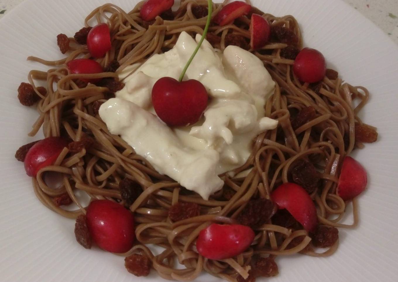 - En la mesa colocamos las fuentes de fideos, la pechuga con queso, las cerezas y las pasas y así cada comensal puede servirse la cantidad que guste en su plato, mezclando todos los ingredientes.