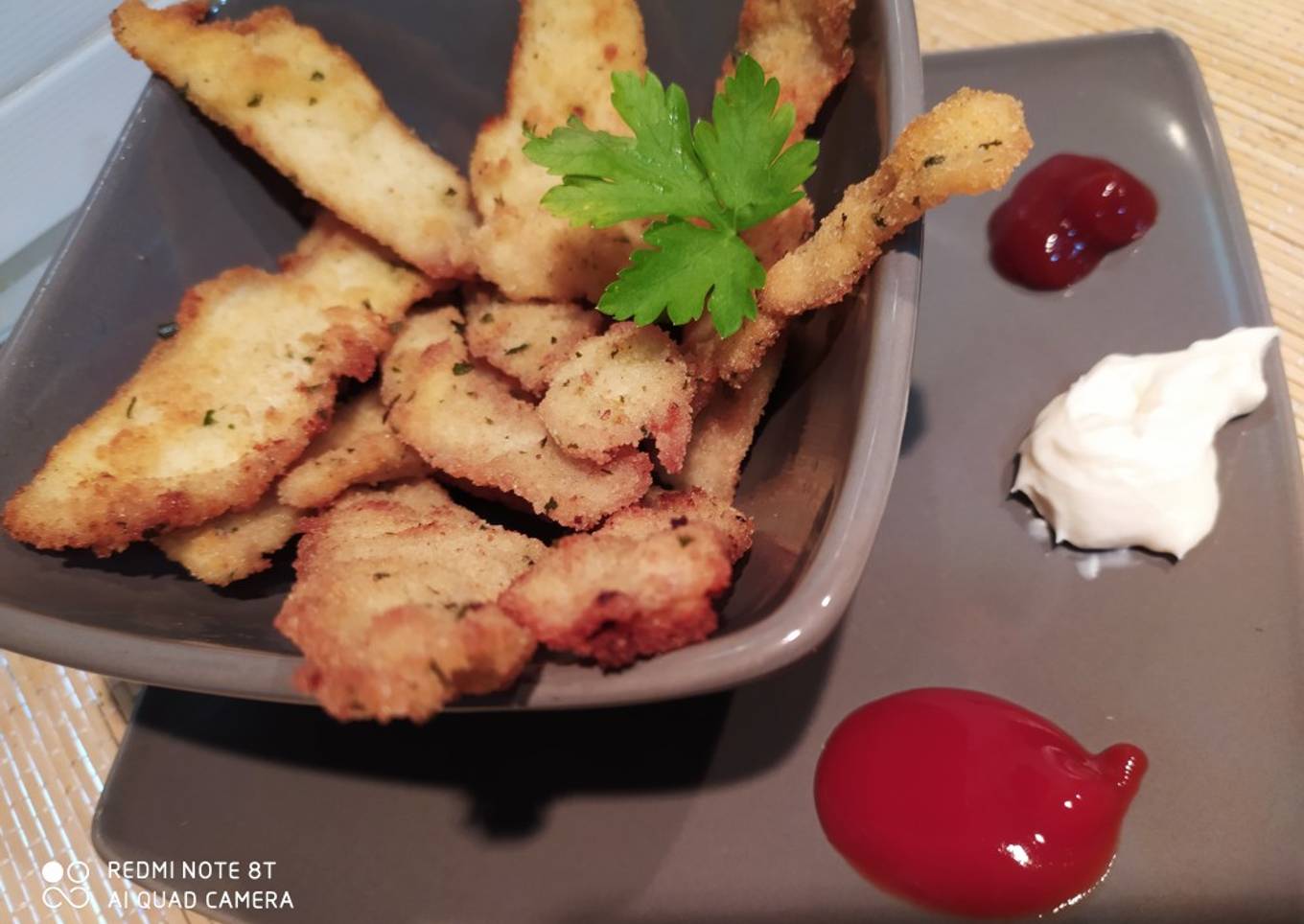 - Añadimos las tiras de pollo con el huevo en el pan rallado(rebozado)