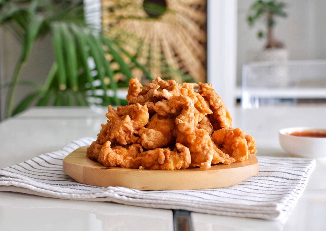 - Incorporamos los trocitos de pollo en el aceite y freímos el pollo en varias etapas.