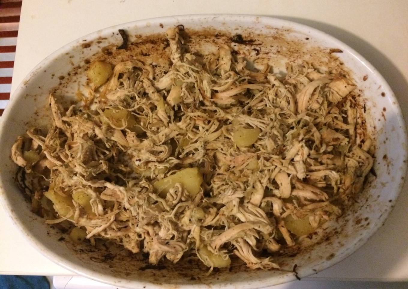 - Pela las papas y cortalas en rodajas no muy finas colócale una pisca de sal y ajo en polvo añade un poco de agua con la que hicistes hervir las pechugas también un poco de aceite de oliva extra virgen y colócalas al horno con temperatura media.