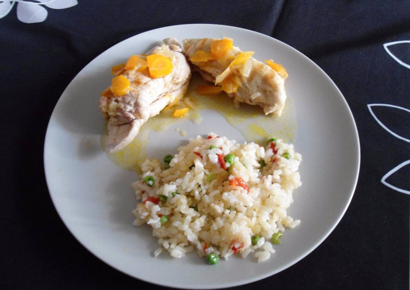 - Para acompañar se cuece arroz en abundante agua unos 15 minutos, se escurre y se echa en una sarten con un poco de aceite se agrega los guisantes el pimiento rojo (se puede utilizar una latita) se saltea durante unos minutos. Eliminar el hilo de las pechugas y se sirve con la salsa y el arroz salteado.