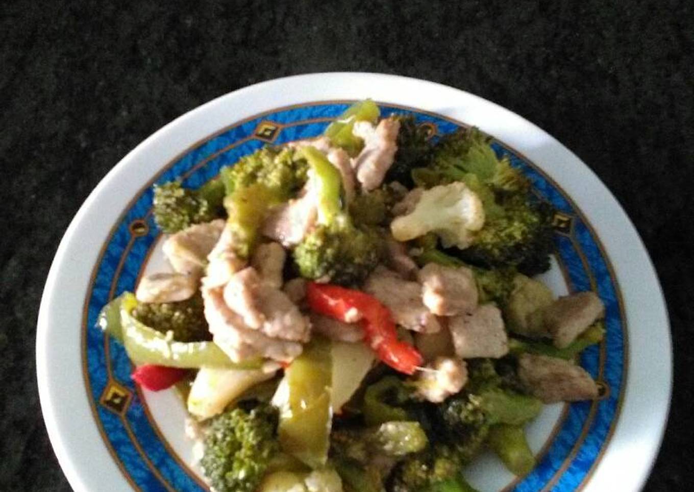 - Se parte la pechuga a trocitos, se lava la verdura y se cortan los pimientos a tiras, la coliflor y el brócoli a tallitos, y los ajos a trocitos, se pone todo en una escurridera.