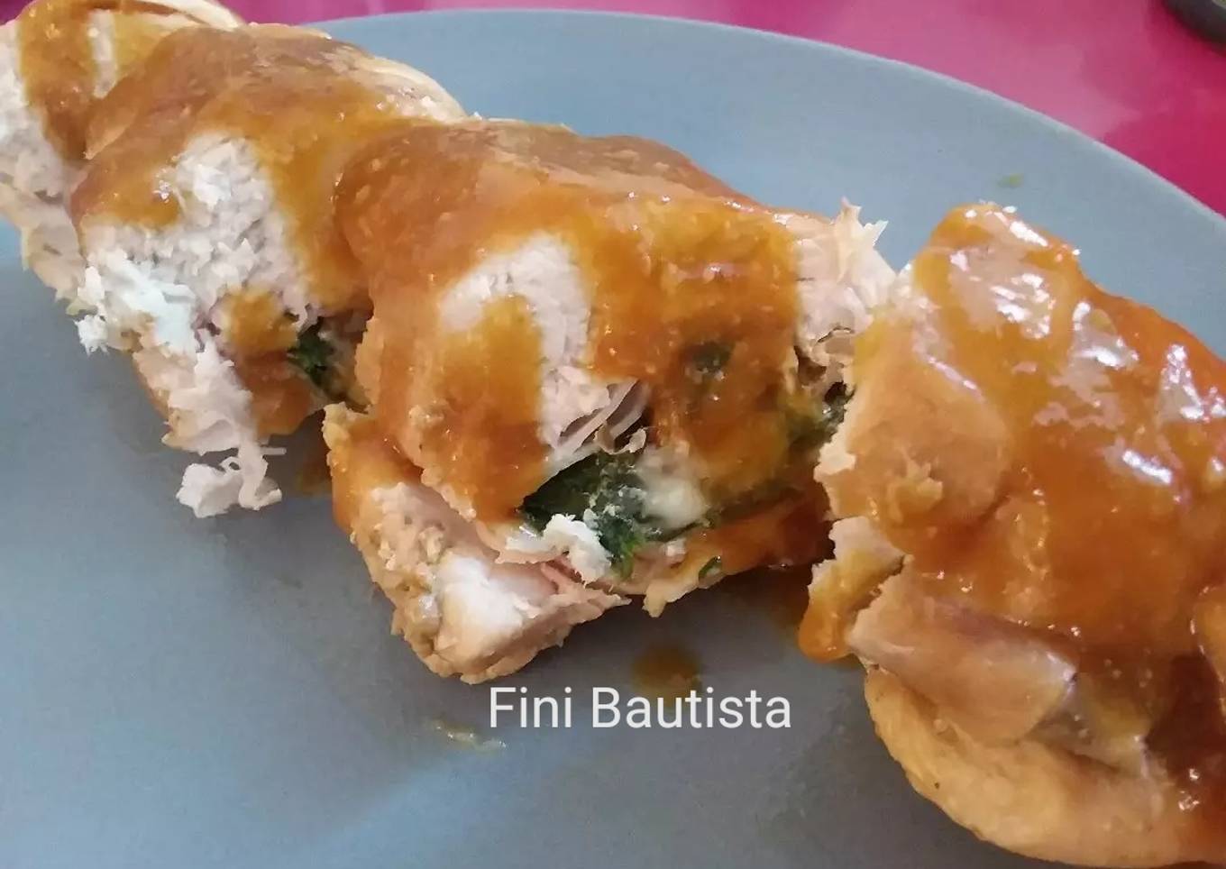 - Abrimos la pechuga por un lateral en forma de libro, salpimentamos y ponemos dos lonchas de pavo unas hojas de espinacas frescas y el queso cortado a cuadritos le espolvoreamos unas nueces, cerramos y brindamos