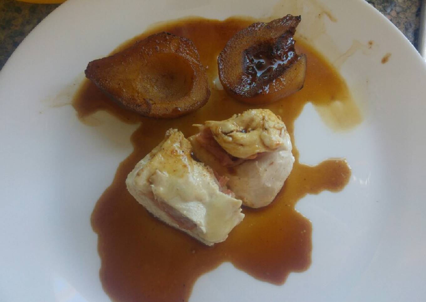 Pechuga de pollo rellena de jamón y queso con peras al vino