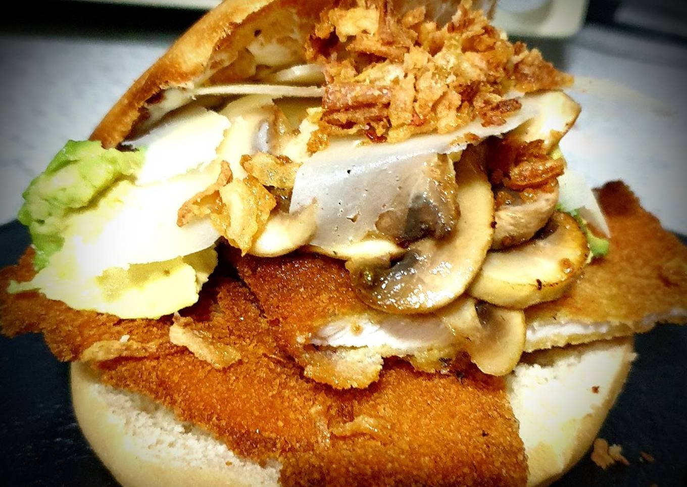 - Monta ya el filete de pollo, la cebolla frita (puedes hacer los aros de cebolla que están en mi recetario si tienes tiempo), coloca los champiñones y algo más de aguacate ¡¡ a comer!!