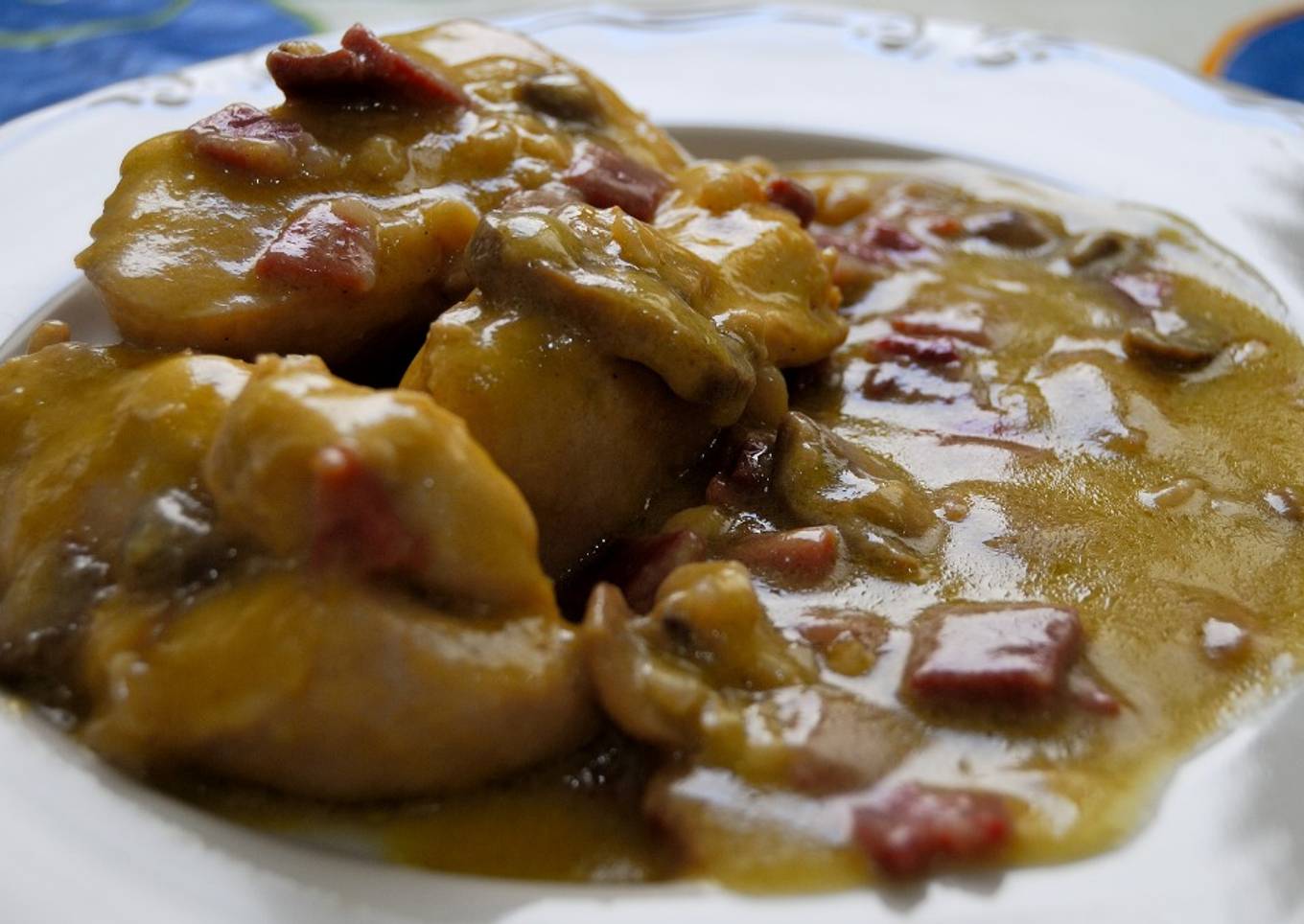 - Volvemos a incorporar el pollo a la cacerola, le vertemos encima la salsa y agregamos los champiñones laminados, los piñones y el jamón. Se deja a fuego medio 5 minutos más, moviendo de vez en cuando para que se integren los sabores.