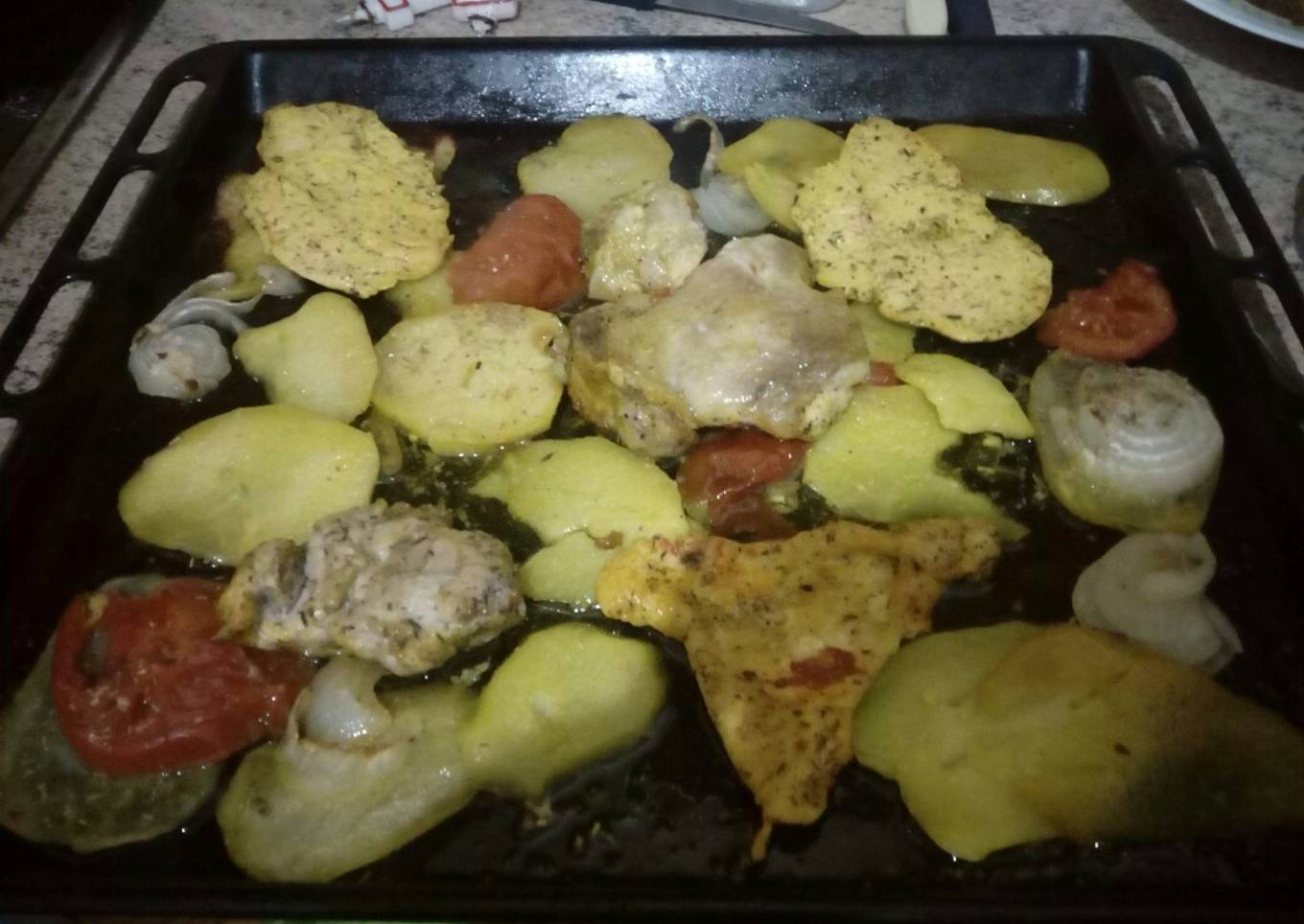 - Especiar la carne y dejar reposar 1h en el frigo. Salpimentar las patatas cortadas, la cebolla cortadas y el tomate a rodajas