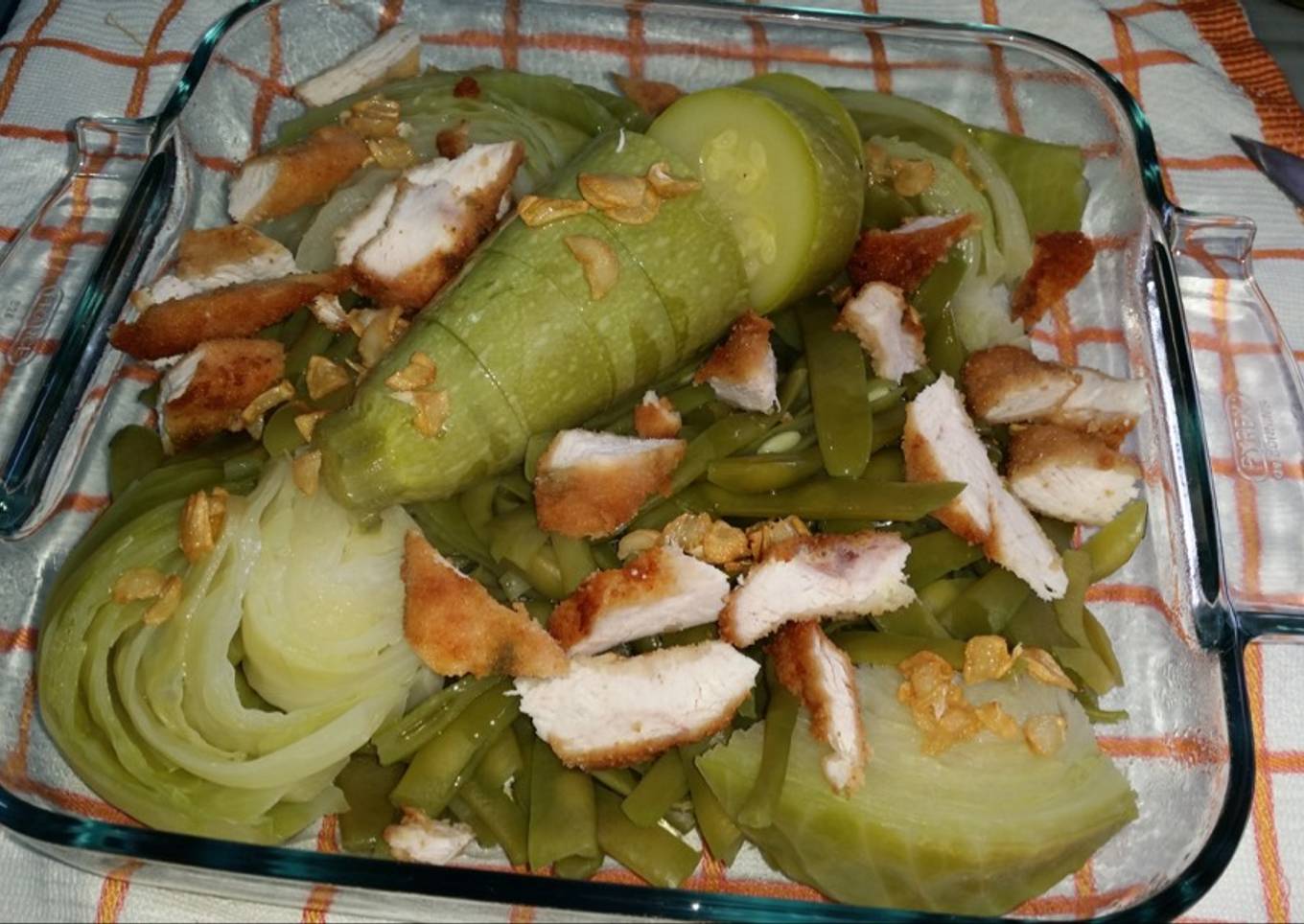 - Mientras se van friendo 2 pechugas empanadas, iremos escurriendo la verdura con una espumadera y la colocaremos en una bandeja, cuando ya la tengamos toda colocada, ponemos los ajos con el aceite frita por encima. Y luego trocearemos las pechugas empanadas.