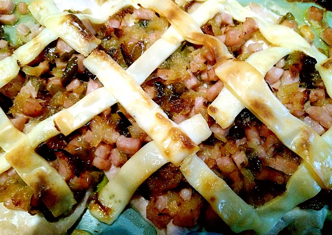 - Pochar la cebolla y el pimiento muy picaditos. Cuando la cebolla esté transparente añadir el calabacín picado. Por último el jamón cocido a trocitos. Poner el horno a calentar.