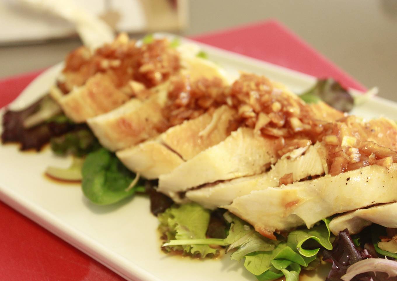 Pechuga de Pollo con Cebolla Marinada en Soja y Ensalada