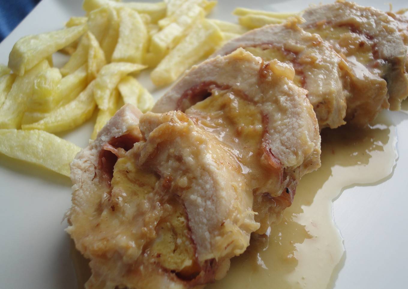 Pechuga de pollo rellena de jamón, queso y tortilla en salsa de vino y cebolla