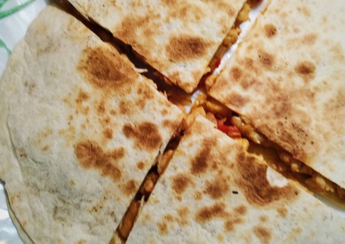 - Apartamos a un plato y en esa misma sartén ponemos una tortilla de trigo, encima de esta la mezcla del pollo, un poco de queso y otra tortilla encima