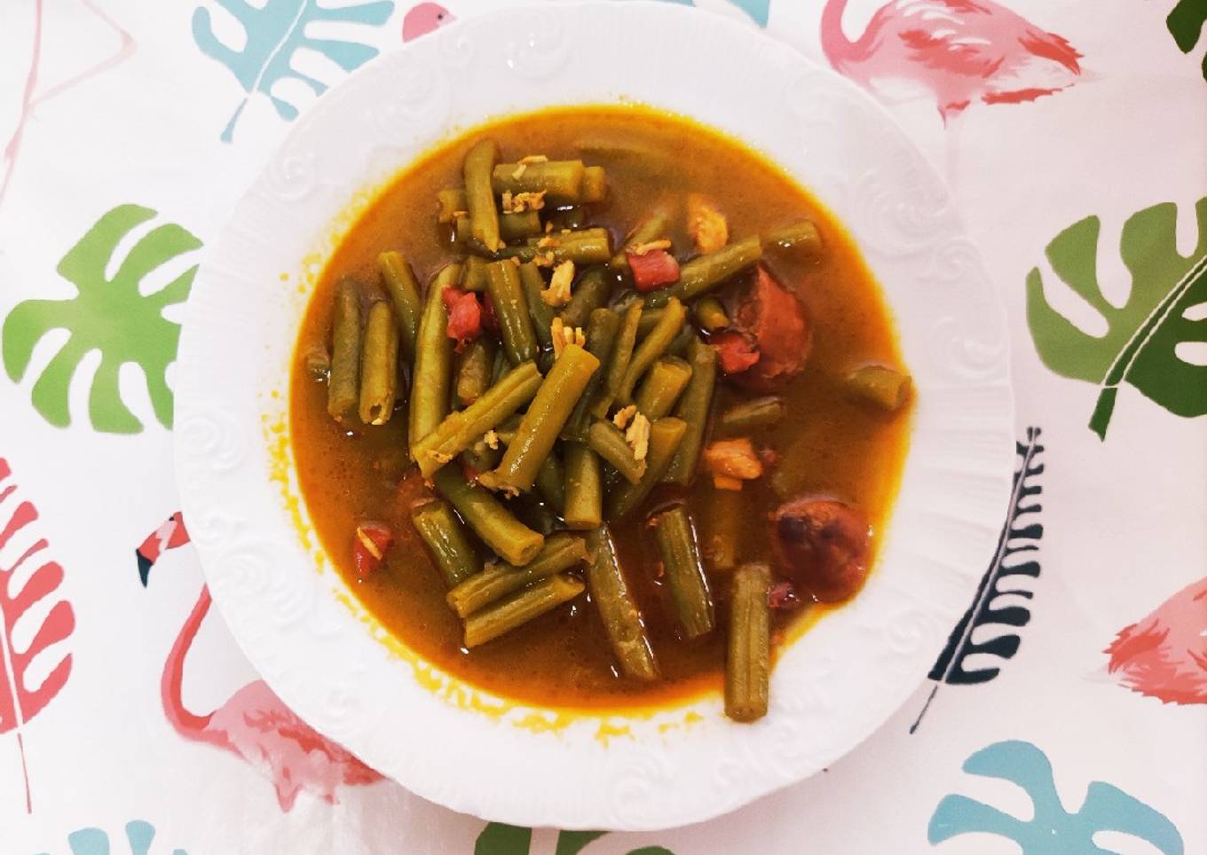Tenía un sofrito en el congelador para hacer unas lentejas o unas habichuelas y me decidí por la segunda opción y no tenía patatas y como no me apetecía salir a comprarlas improvisé un potajillo de judías verdes y la verdad es que no está nada mal